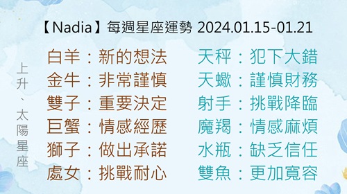 【Nadia】每週星座運勢 2024.01.15-01.21
